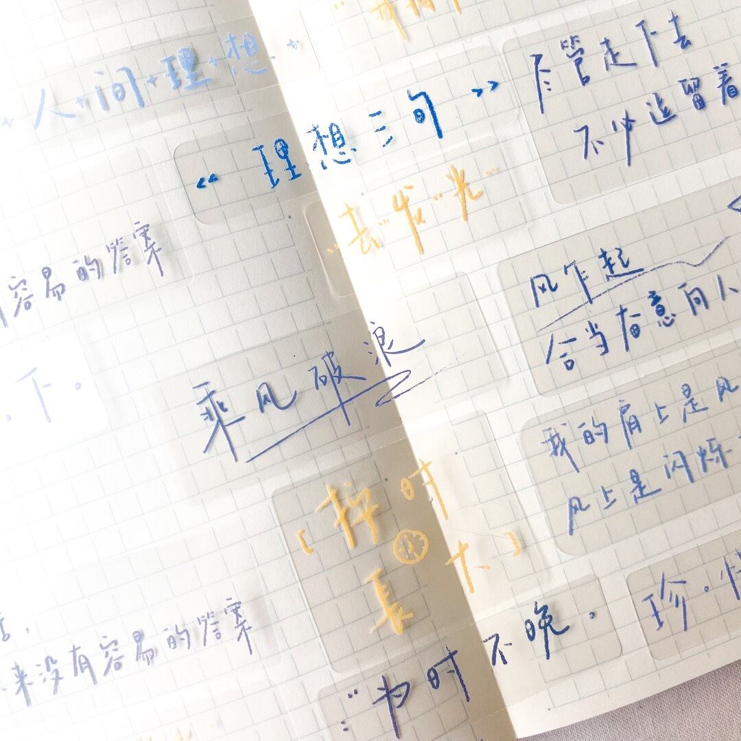 手書きの中国語が書かれた透明なシールです。透明なので、どこにでも貼りやすく使いやすいです。