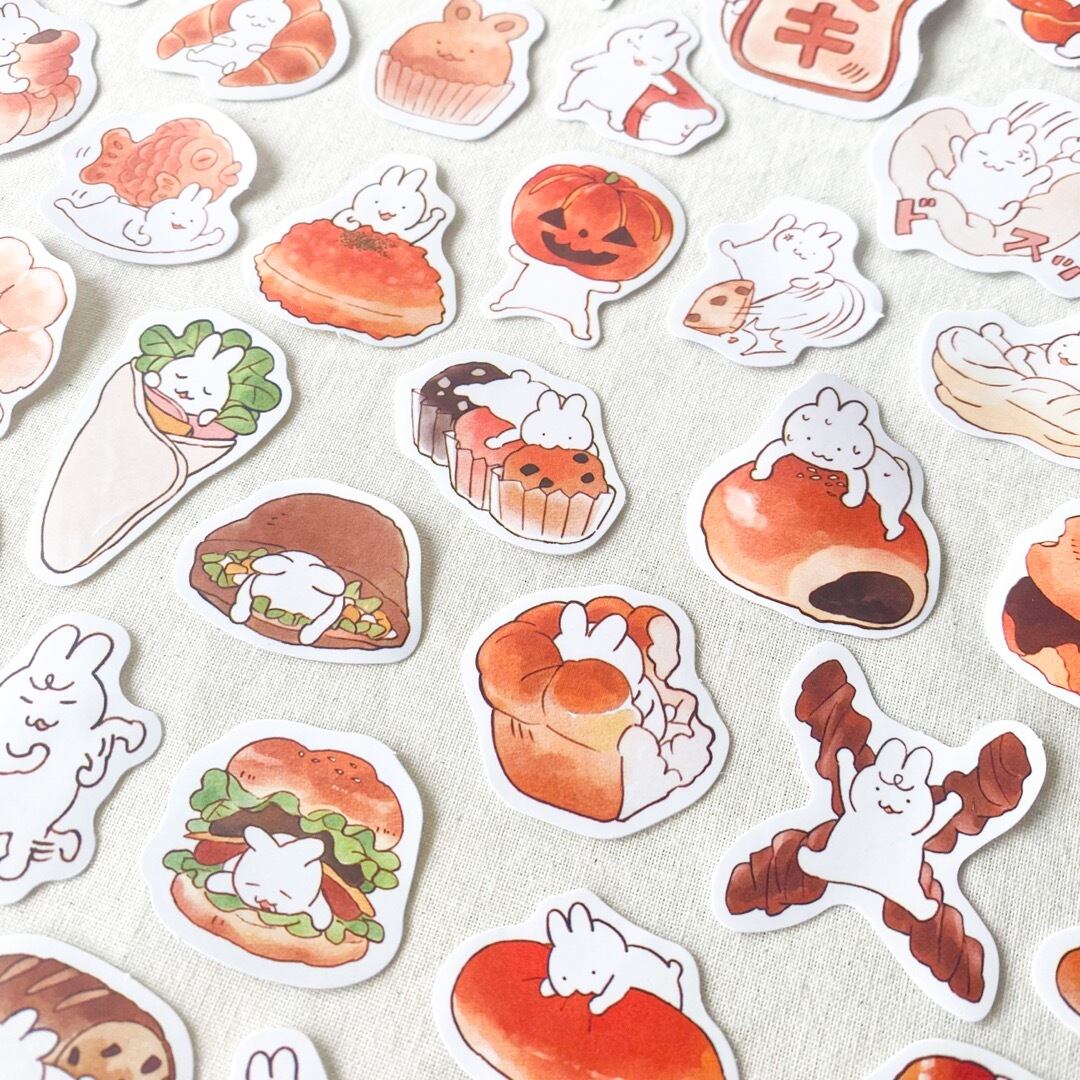 表情豊かなうさぎが、パンを持ったり被ったり挟まってみたりと様々な様子を見せています。