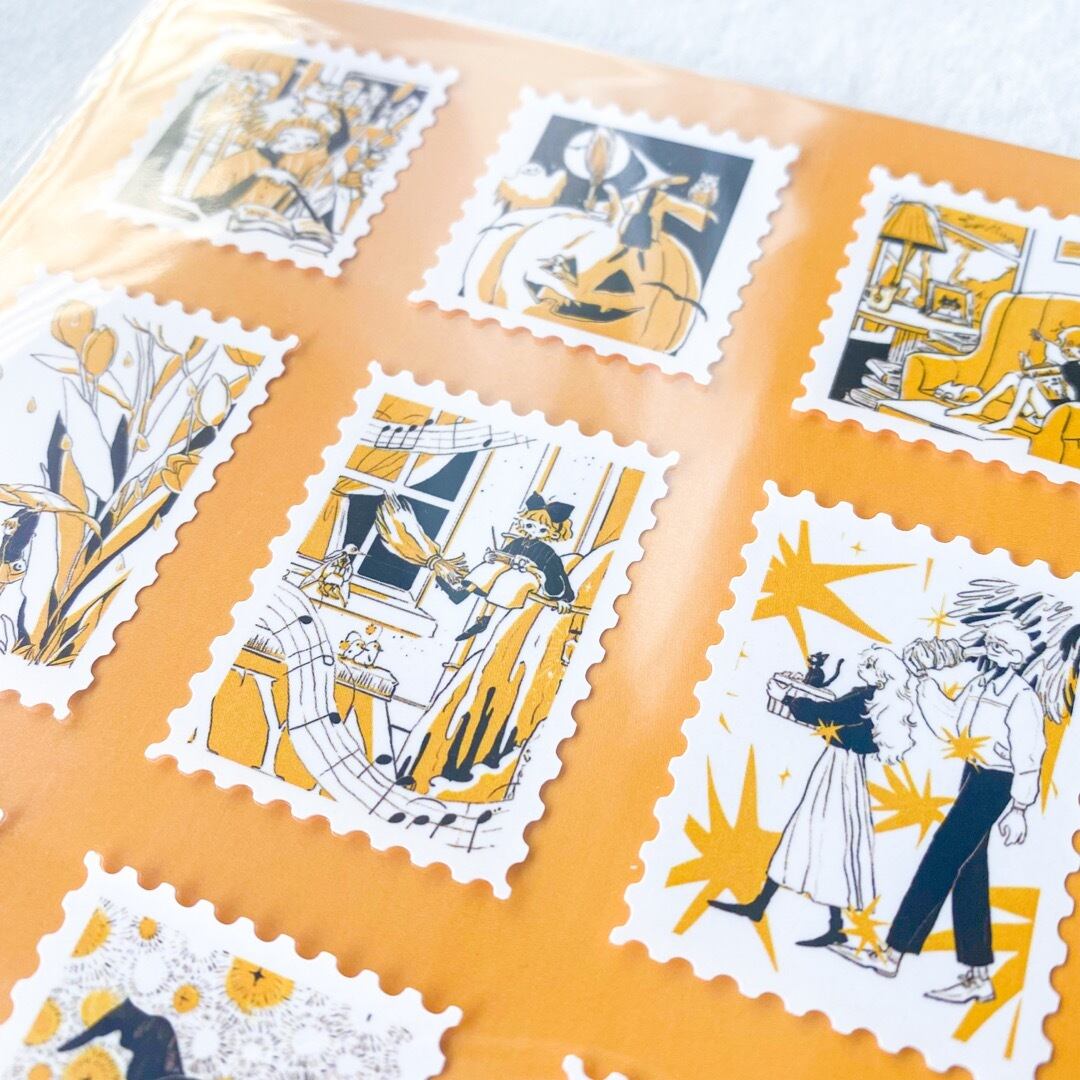 魔法使いの女の子たちが描かれた切手風のシールです。