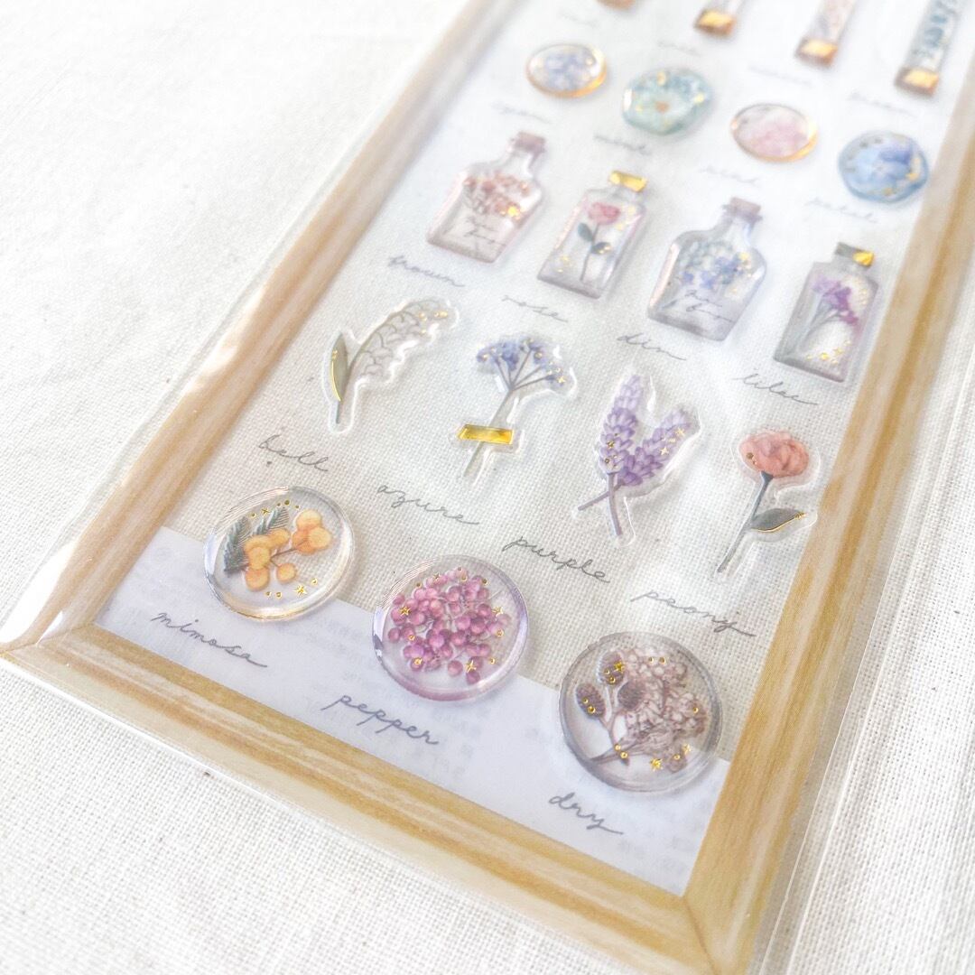 花をテーマにした立体シールです。標本として飾られているようなデザインで、透明感がありとっても可愛いです。